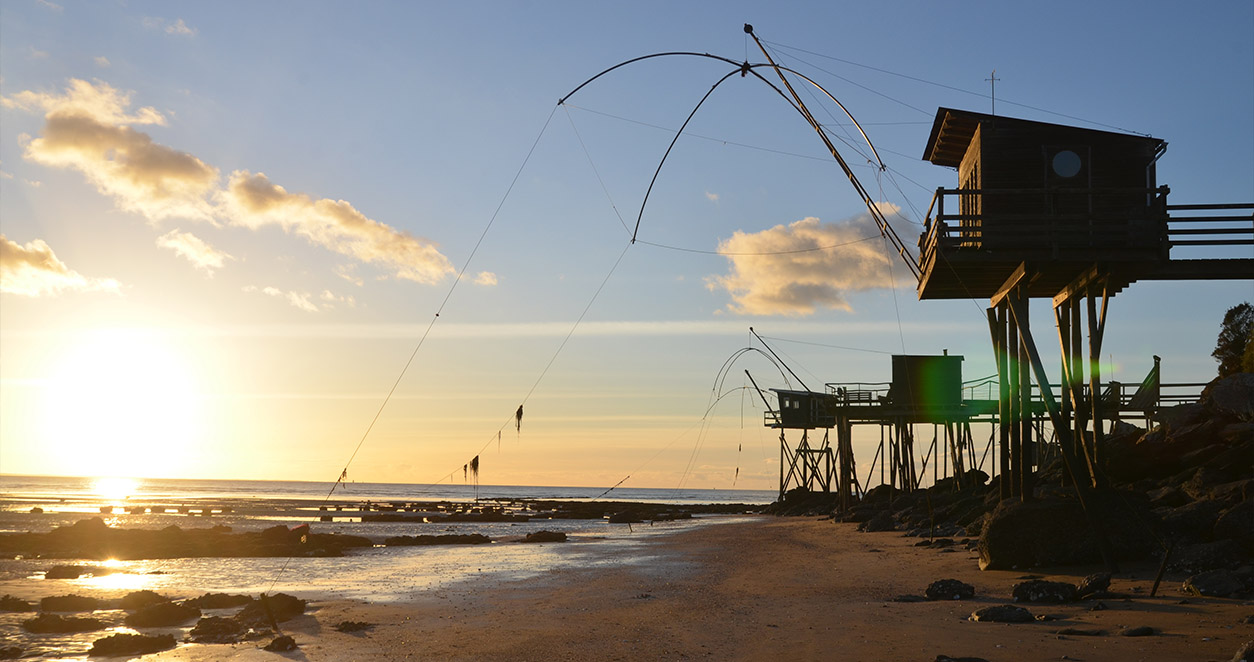 Les efforts seront récompensés quand vous serez attablés devant un plat de poissons, coquillages et autres crustacés, sous un superbe coucher de soleil. Les fameuses petites cabanes sur pilotis, avec le filet suspendu, sont emblématiques des pêcheries. Certaines sont à louer pour la journée ou la nuit, avec le vélo en toute sécurité. Une possible halte à Pornic permettra de se dégourdir les jambes le long du chemin des Douaniers ou de profiter d’un vieux gréement pour une sortie en mer.