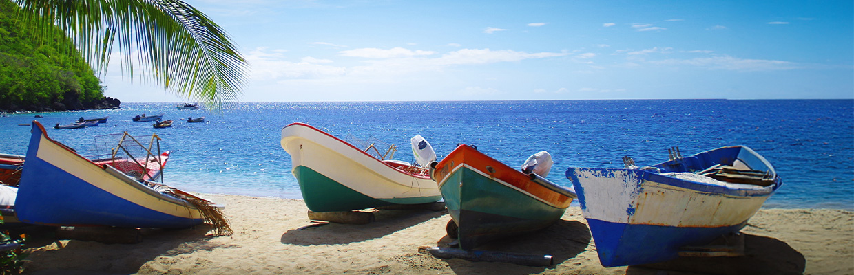 Plage, palmier et bateaux face à la mer des caraïbes. Paysage de la Martinique ©Nathie - Adobe Stock